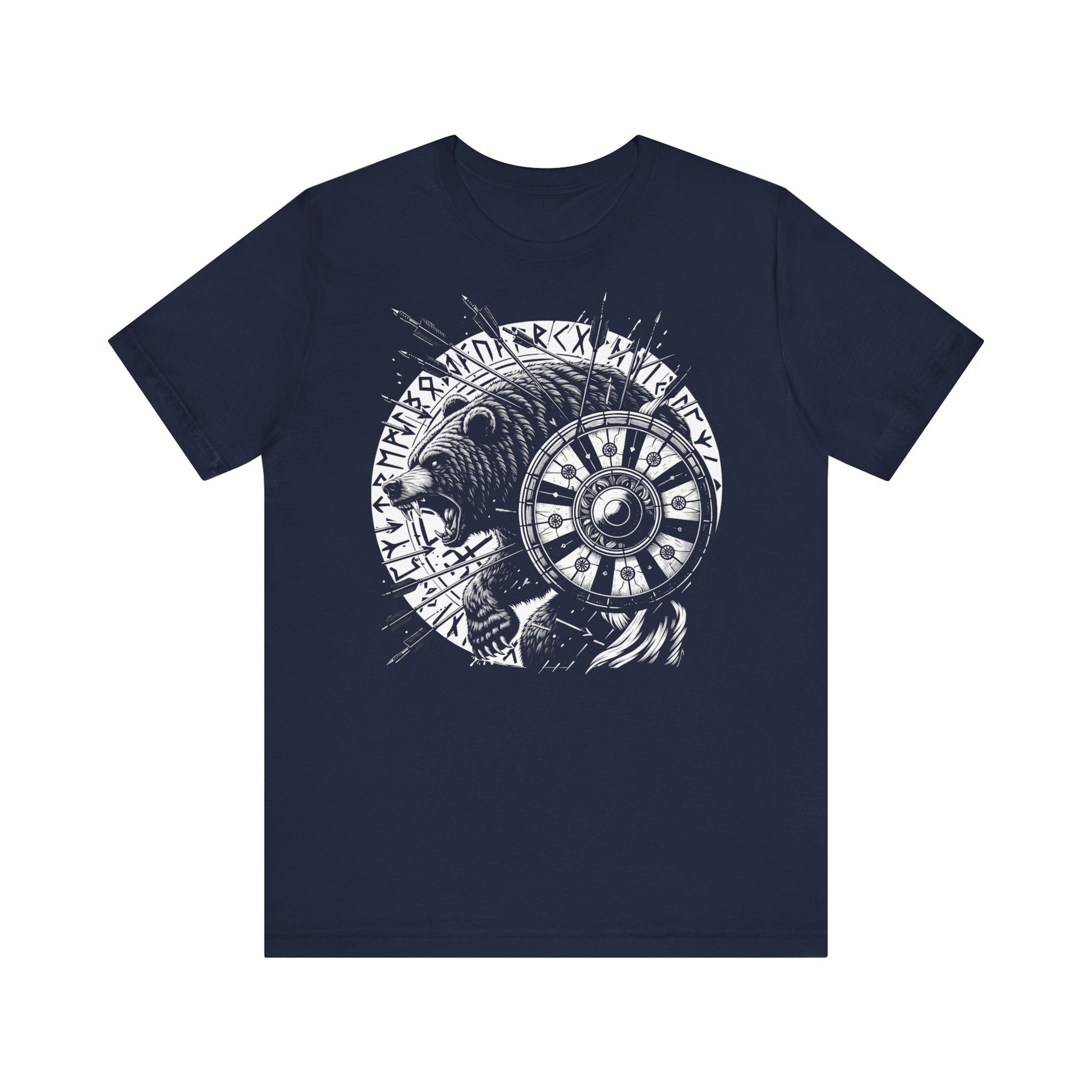 Das eindrucksvolle Design zeigt einen furchtlosen Bärenkrieger mit Runensymbolen und Schild - ein Symbol für Stärke, Wildnis und unbesiegbare Kampfeslust. Eine starke Geschenkidee für Wikinger-Fans und Freunde nordischer Mythologie.